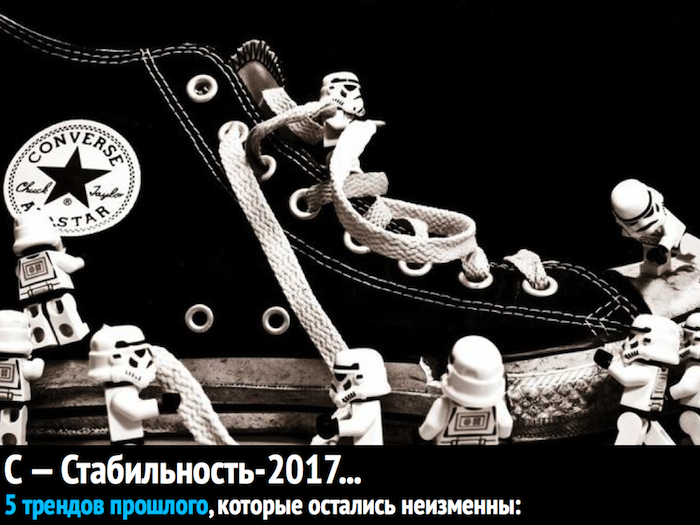 «ВАЖНО: всё, что вы прочитаете в этой аналитической заметке — моё личное мнение. Я не претендую на статус «истина в последней инстанции». Просто делюсь с читателями TRN своим восприятием будущего. Можете со мной согласиться, можете поспорить. В любом случае, держите в голове то, о чём я расскажу, когда сядете прописывать план на 2017’й для себя и своего бизнеса.