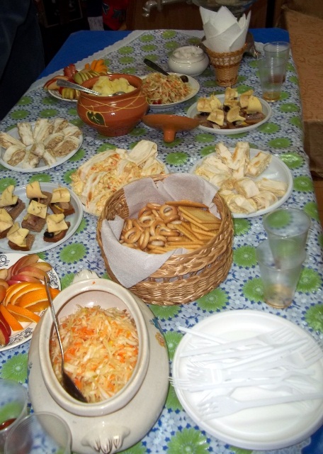 Особый интерес у гостей вызвали забавные обереги ручной работы с такими же забавными названиями: домовенок, лихоманки, лихорадки (этих аж 12 штук – трясея, желтея, дряхлея, глухея ). «Дом вести, не рукавом трясти» - с этими словами хозяева пригласили журналистов к столу, на котором красовалась истинно русская еда: капуста, картошечка, пирожки, домашнее вино. После такого теплого приема очень не хотелось выходить на зимнюю стужу, но впереди ждала Епифань.