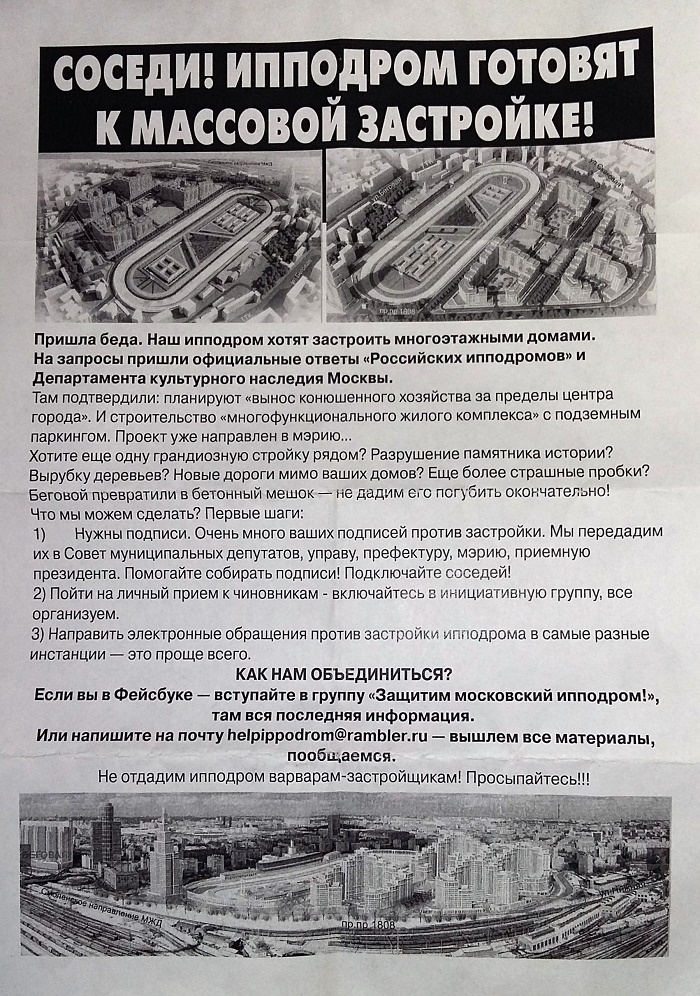 В тексте обращения к жителям говорится: «Мы категорически против утверждения проектов реконструкции территории объекта культурного наследия — Центрального Московского ипподрома (Беговая ул., 22, корп. 1), его объединенной охранной зоны — с размещением многофункциональных жилых комплексов, иных многоэтажных объектов капитального строительства, а также подземных паркингов. Многоэтажная застройка территории ЦМИ ухудшит экологию Бегового, приведет его к транспортной катастрофе, многократно увеличит нагрузку на инфраструктуру района, фактически изуродует охранную зону объекта культурного наследия, самым негативным образом скажется на развитии конного спорта в Москве и российской коневодческой индустрии. Требуем отклонить подобные проекты, представленные на рассмотрение Правительства г. Москвы и Совета директоров П