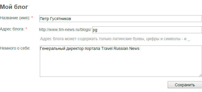 В форме настроек блога тоже все очень просто - заполняете примерно так, как у меня и жмете кнопку Сохранить:
