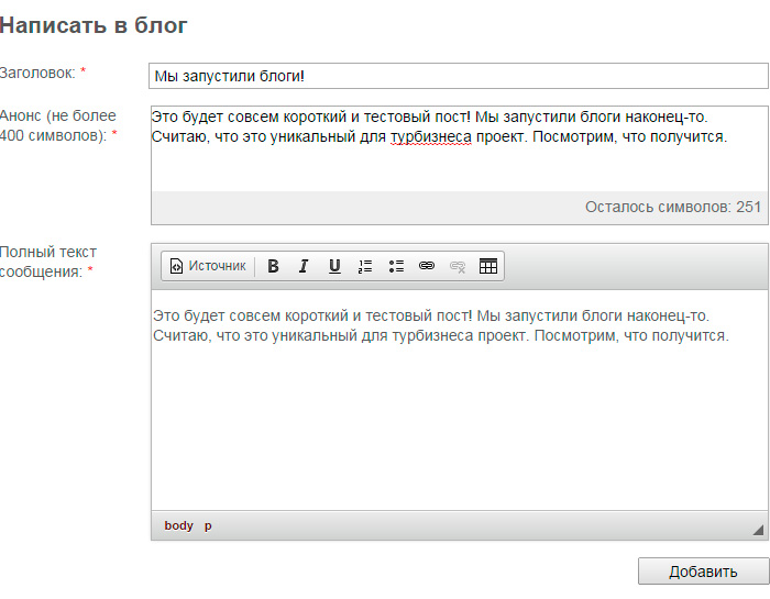 Переходим по ссылке Написать в блог и видим очень простую форму добавления нового поста.