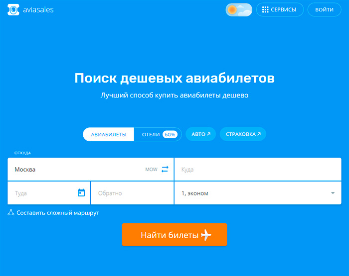 Здесь можно приобрести авиабилеты по выгодным ценам практически на все направления. На сервисе Aviasales предоставляется возможность выбора самых выгодных предложений посредством автоматизированного поиска. Пользователю не нужно тратить время на сравнение условий от разных компаний, занимающихся авиаперелетами. В кратчайшие сроки Aviasales выберет оптимальный вариант среди предложений от сотни агентств и 728 авиационных компаний.