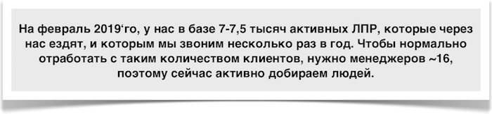 Каждый год (с 2014’го) мы получали 1,5–2 тысячи новых обращений, из которых минимум половина попадала в нашу активную клиентскую базу. Таким образом, мы пришли к этой цифре (4500 ЛПР). Для того, чтобы качественно с такой базой отработать, нужно как раз ~8–10 менеджеров.