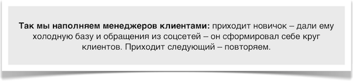 Поэтому сейчас мы это решаем так: приходит новый менеджер, и мы его нагружаем нашей холодной базой — клиентами, которые ‘обращались и не купили’ или ‘покупали