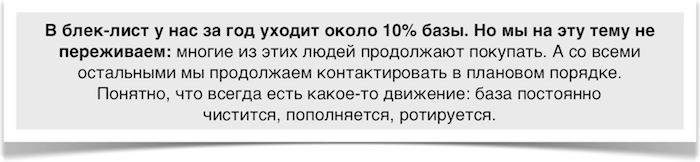 На самом деле, менеджерам так работать даже легче. По клиентам, с которыми идёт постоянная коммуникация через регулярный обзвон и рассылку, конверсия стабильно превышает 45%. Сравните это с новыми клиентами, на привлечение которых ещё и деньги надо тратить: конверсия по ним всегда ниже, а цикл сделки — длиннее.