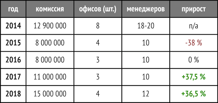 По деньгам в 2017’м мы вышли на объемы докризисного 2014‘го. Сделали это 3’мя офисами и 8-10’ю менеджерами (в 2014’м такой же объем делали 8 офисов и 20 сотрудников).