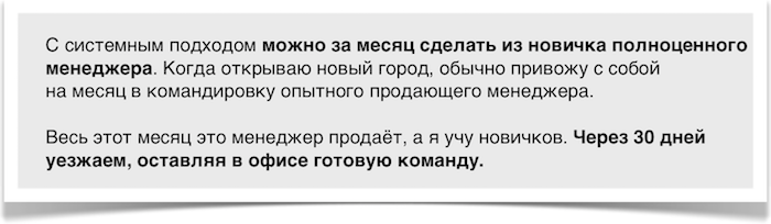 А третье — хороший «лидген». Нет ничего хуже, чем уехать, не загрузив своих менеджеров работой. Загрузил — у них жизнь наладилась — и всё хорошо. Люди работают на отлично только когда загружены на 100%.
