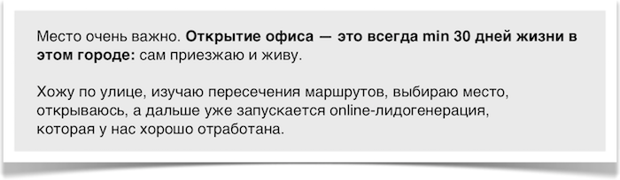 Т.М.: Вот мы и подошли к главной теме интервью — лидогенерации. :) Каждый раз, заходя в новый город, ты заново выстраиваешь процесс поступления новых обращений, ведь раньше офиса не было, и про него никто не знает. Какие технологии используете? И как вам удаётся раз за разом решать эту проблему? …ведь многие директора в своих родных городах не могут с ней справиться.