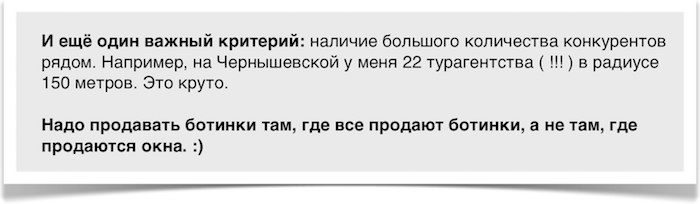 Если ты конкурентоспособен, то надо идти в ту среду, где куча туристов. Конкуренты тогда становятся источником новых клиентов, а не проблем.