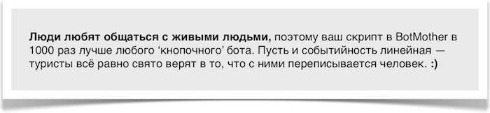 Никто из 9500 подписчиков, с которыми пообщался бот за год, нам не написал: «ты чё там, слепая что ли?!" А тот эффект, который он нам даёт (дожим при взятии телефона, моментальное реагирование, экономия времени менеджера) — сложно переоценить.