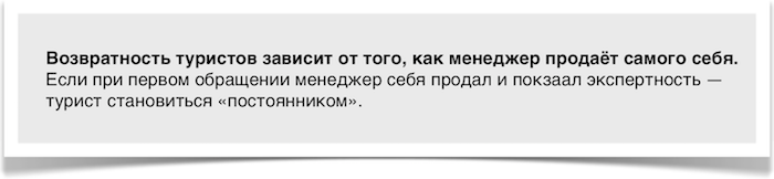 Менеджер может «просто продать тур». Результатом станет «одноразовая» продажа. А может «продать себя». Я часто вижу в переписках, как клиенты девчонкам фотки присылают — у них там дружба и хорошая коммуникация — сразу видно: это теперь наш «постоянник».