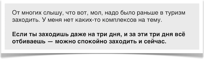 Может быть, помогает то, что я пришёл в туризм не из туризма, и поэтому не зашорен теми комплексами и страхами, которые есть у людей, которые раньше самостоятельно продавали туры.