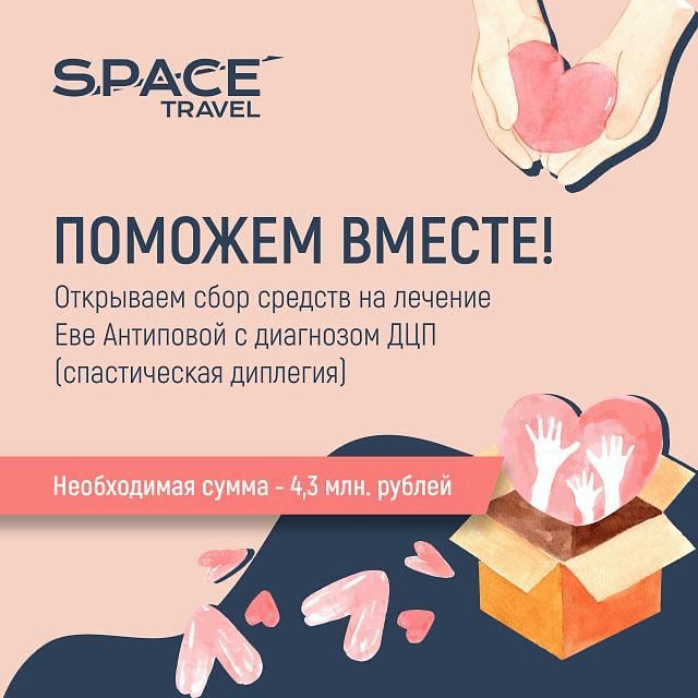 Туристический бизнес – одна большая семья. Как бы нам тяжело не было, когда один из её членов попадает в тяжелую жизненную ситуацию, мы всегда приходим на помощь. Сегодня мы хотим поддержать одну из сотрудниц туроператорской компании Space Travel, в семье которой есть прекрасная девочка Ева Антипова с диагнозом ДЦП.
