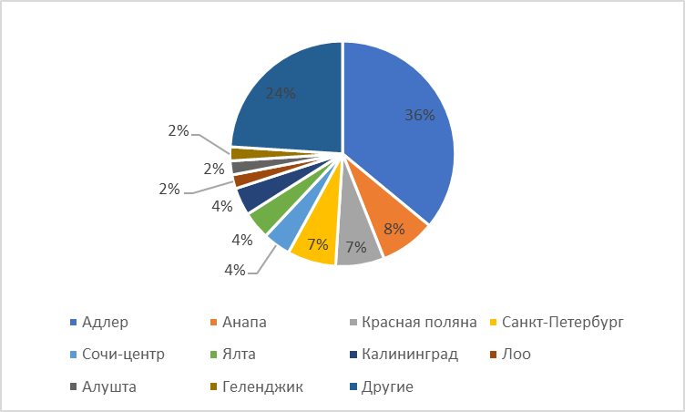 Самым дорогим курортом оказалась Ялта — средний чек по этому направлению составил 58 000 рублей, на втором месте идет Алушта со средним чеком в 55 000 рублей. Третье место заняли отели в центре Сочи — средний чек на отдых в таких местах составил 50 000 рублей. Известный своим круглогодичным водным центром курорт Лоо вышел на четвертое место по стоимости отдыха со средним чеком 46 000 рублей. Пятерку российских курортов с самым высоким средним чеком замыкает Анапа — 43 000 рублей. Средняя стоимость отдыха в Адлере осенью составила 37 070 рублей. За туры в Геленджик россияне в среднем платили 34 000 рублей. Столько же стоил и отдых в Красной Поляне — 34 000 рублей. Дешевле других оказались северо-западное и северное направления — средний чек на отдых в Калининграде и области оказался 27 000 рублей, в то время как за тур в Санкт-Петербурге в среднем платили 24 000 рублей.