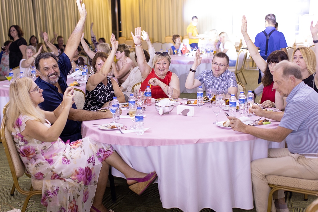 Сначала было решено перенести гала-ужин на час раньше, чтобы успеть до шторма в 21:00, поскольку ужин планировался на пляже. В 17 часов Метеослужба сообщила, что ветер усилился, в Кемере уже шёл проливной ливень с крупным градом и мероприятие на пляже необходимо было отменять. И тут организаторы приняли волевое решение, чтобы сохранить праздник, перенести гала-ужин в конференц-зал на 19:00. Всего за 2 часа вся тяжёлая техника и оборудование, весь бар, угощения, закуски и даже фейерверки были перевезены в конференц-зал. Гала-ужин состоялся! Вечер начался с выступления Анны Малининой и продолжился благодарственным словом от Алёны Славянской, поздравлениями и тостами от Партнеров Сети: с пожеланиями выступили Алексей Бычок (ООО «Йети Тур»), Светлана Панова и Наталия Хоминич (АО «ЕРВ Туристическое страхование»), Анна Филиппова («Мой Агент»), Андрей Сергеев и Михаил Садов (ООО «Объединённая Страховая Группа»), Светлана Шваб (АО «АльфаСтрахование»).