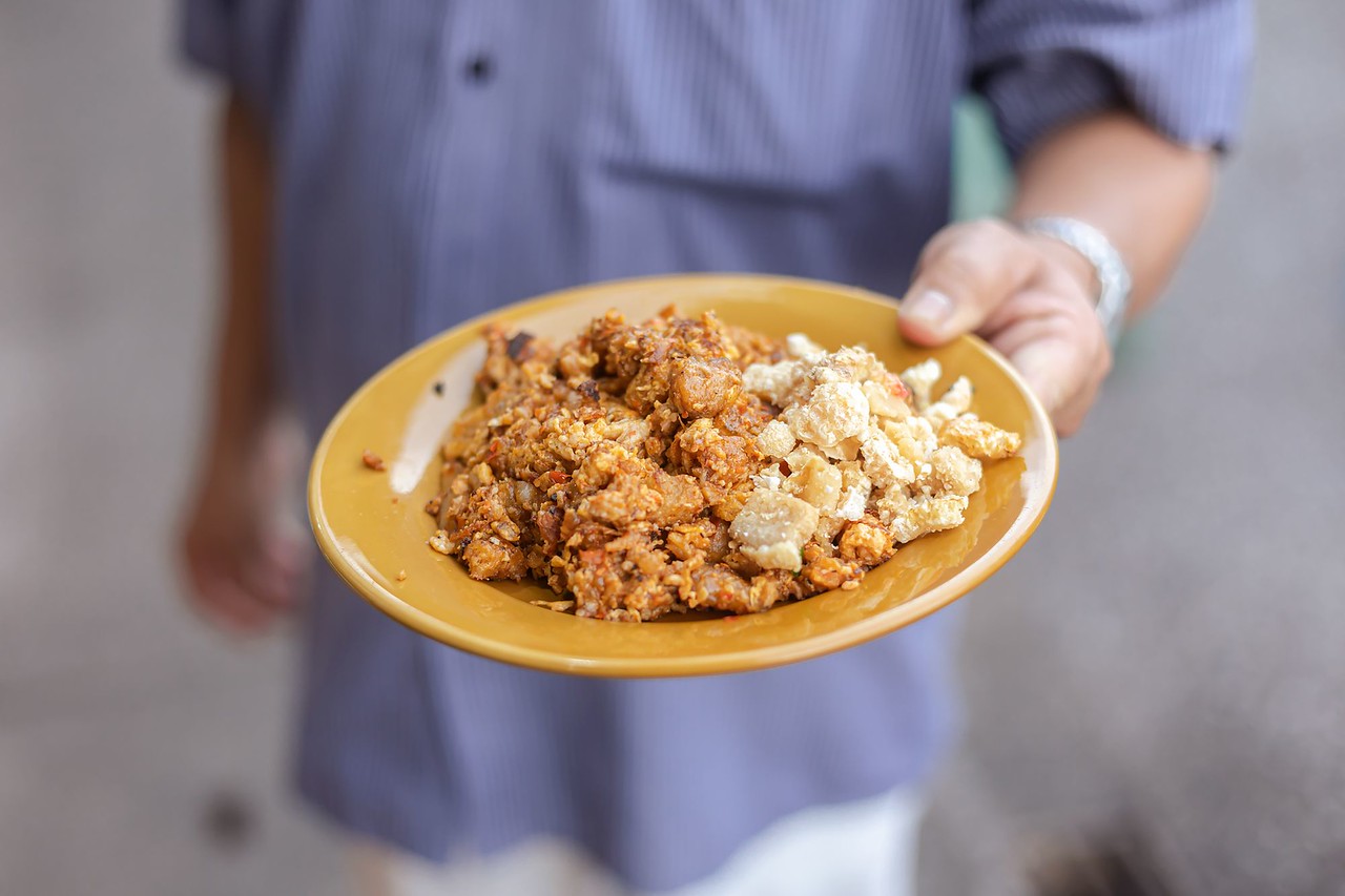 Блюдо из свиных субпродуктов – кишечника, сердца, легкого, ушей. Оно тушится в смеси пяти ароматных специй с добавлением трех соусов: пикантного, кисло-сладкого и изготовленного из тамаринда, пальмового сахара и перца чили.