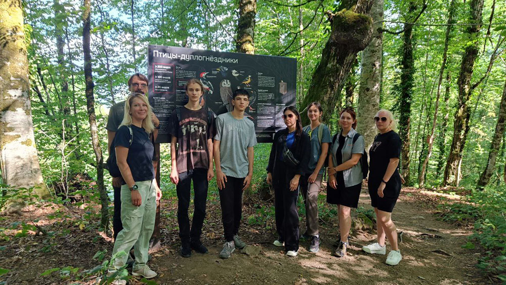 - Стажировка на Курорте Красная Поляна дала нам возможность не только глобально изучить процессы, но и обратить внимание на маленькие и при этом очень существенные детали. Например, здесь используют большие диспенсеры для шампуней и гелей для душа, которые исключают использование мелких одноразовых пластиковых упаковок. Плюс мы увидели, как можно сделать изучение природы увлекательным: на экотропе Папоротниковая есть очень любопытные интерактивные инфостенды с музыкальными инструментами и специальные аудиальные приспособления, которые позволяют более отчётливо услышать пение птиц. Хотелось бы также отметить и очень информативные стенды непосредственно на маршрутах. Они позволяют изучить местную флору и фауну, - отметил научный руководитель команды, заместитель председателя отделения РГО В Республике Адыгея, научный сотрудник Кавказского заповедника, доцент МГТУ Алексей Бибин.