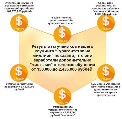 Но при этом за то же время почти 300 туристических компаний из России, Украины, Белоруссии, Казахстана, которые участвовали в международной коучинговой программе «Турагентство на миллион», смогли резко увеличить свою прибыльность за счет полного изменения самой технологии продаж туров в своем турагентстве, а также запуска новых систем привлечения клиентов.