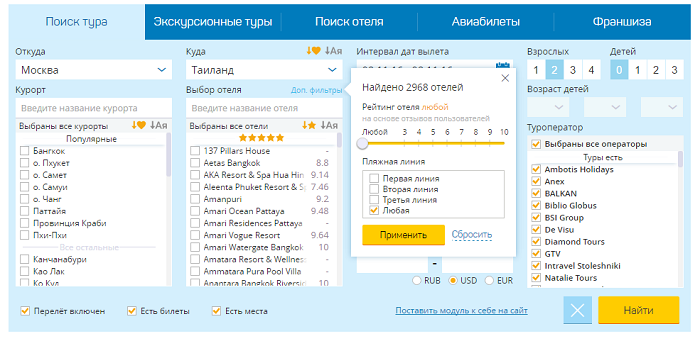 - Форма поиска туров Слетать.ру содержит дополнительные фильтры, которые позволяют конкретизировать поисковый запрос. Кроме даты путешествия, города прилета и других стандартных параметров, вы можете указать рейтинг отеля и пляжную линию. Чем больше фильтров задействовано — тем быстрее вы подбираете нужный тур.