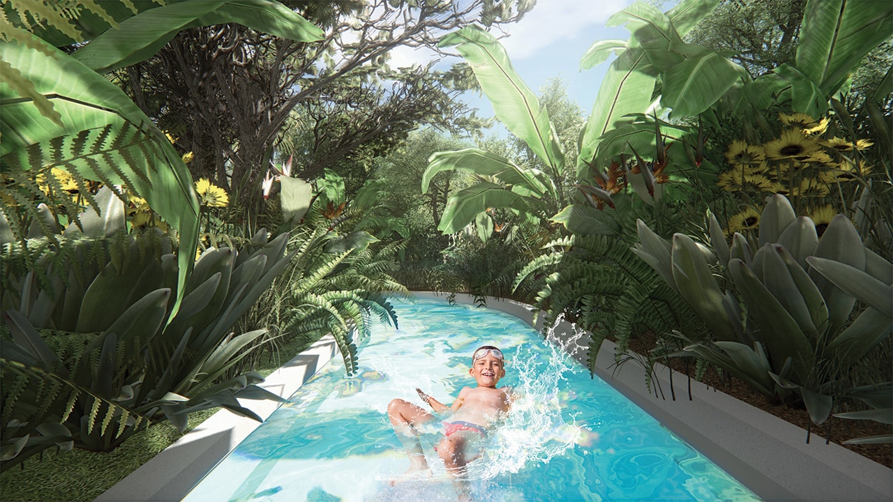 В том числе популярные Камикадзе, Freefall, Турбо Лэнс и Looping Rocket, а также Sunset Playa (оазис для спокойного плавания), Exploral О (разветвленная сеть искусственных рек), Looping Rocket (уникальный скоростной аттракцион, поднимающий гостей на 73 фута над землей и направляющий их затем в горизонтальные трубы, закручивающиеся на 360 градусов), туннель Slide Body (аттракцион для долгого, плавного путешествия, сопровождающегося зрительными и слуховыми эффектами), гигант Slide Body (открытая крутая горка), Twister Racer (четыре водных горки, сплетенные между собой), а также летающие лодки и другие аттракционы.