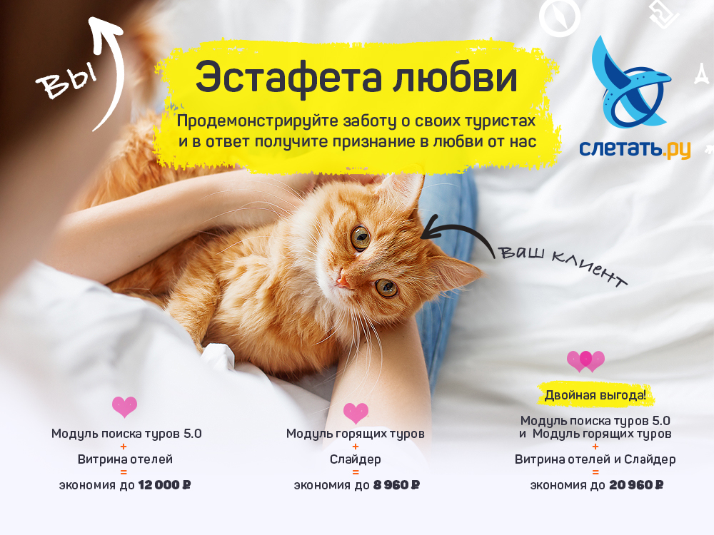 Купите или продлите действующую лицензию на модуль поиска туров или модуль горящих туров с 6 по 17 февраля, чтобы получить подарок от Слетать.ру с любовью.