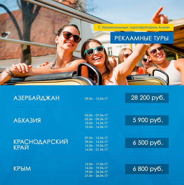 В ходе рекламных туров вы познакомитесь с самыми популярными отелями на курортах, сможете оценить их расположение и ассортимент услуг. Посетите знаменитые достопримечательности и ознакомитесь с инфраструктурой курортных зон, а также насладитесь ласковым южным солнцем, насыщенным морским воздухом и неповторимыми пейзажами курортной местности.