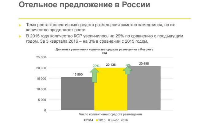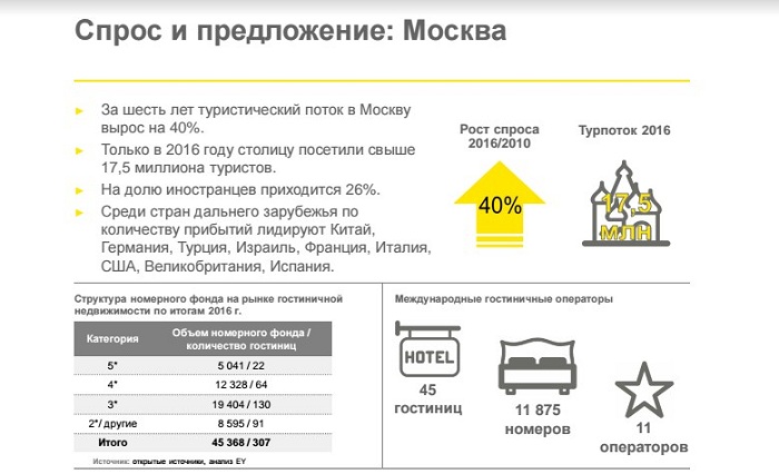 По словам эксперта из Ernst & Young Анны Левиной, на гостиничном рынке следует отметить следующие основные тенденции: восстановление и рост ключевых операционных показателей (загрузки номеров, средней ставки за номер) в 2016 году, снижение темпов открытия новых отелей в связи с относительным насыщением рынков двух столиц и