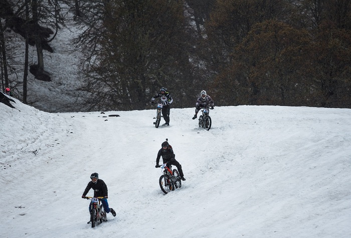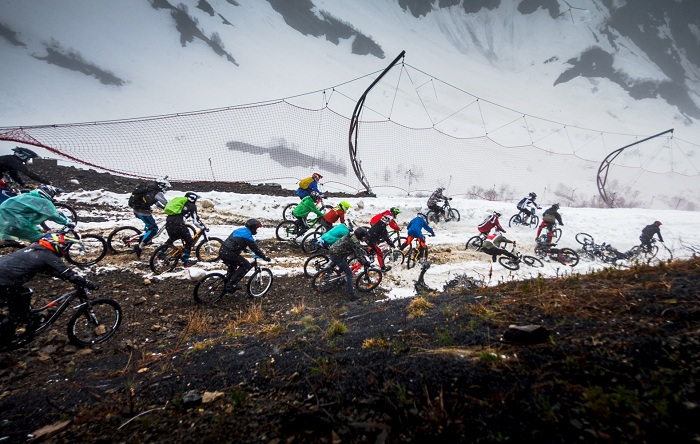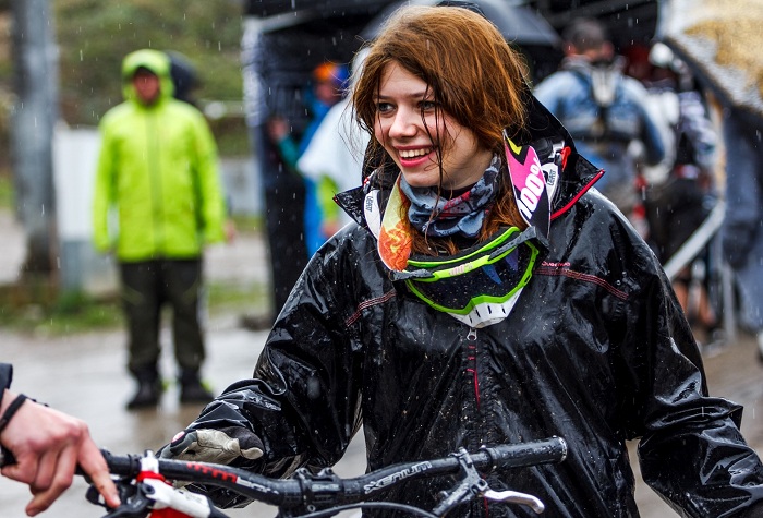 Велоэкстремалы преодолели дистанцию около 5,5 километров. Стартовали в снег на отметке 2200 метров над уровнем моря, финишировали уже под дождем на отметке в 960 метров.