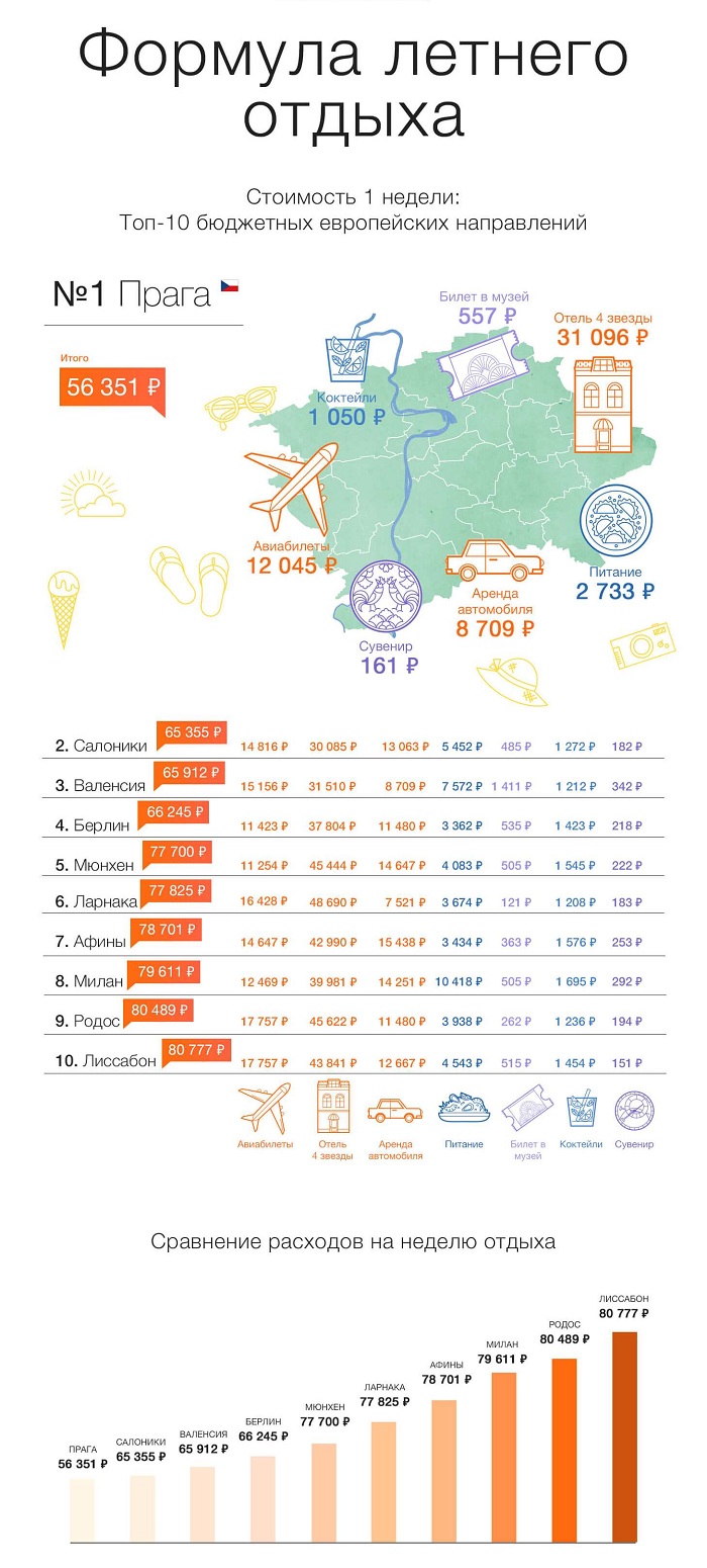 Верхнюю строчку десятки самых бюджетных направлений занимает Прага — целую неделю в столице Чехии можно провести за 56 351 руб. Неудивительно, что в список вошли 3 греческих направления: Салоники, Афины и Родос, ведь Греция традиционно является одной из самых любимых стран для летнего отдыха у россиян.