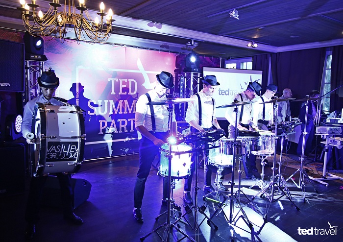Участники Ted Summer Party по замыслу организаторов должны были испытать весь спектр эмоций и задействовать все свои органы чувств и даже «седьмое чувство», благодаря разноплановым и оригинальным выступлениям и конкурсам. Барабанщики из Vasiliev Groove сразу позитивно повлияли на эмоции присутствовавших — задали бодрый ритм вечера. Виртуозная игра на ударных от «Лучшего барабанного шоу России» произвела колоссальное впечатление на гостей.