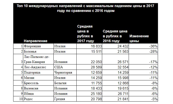 Эксперты туристического поисковика KAYAK.ru проанализировали цифры и выяснили, на каких направлениях стоимость перелетов для российских путешественников максимально выросла и максимально упала в 2017 году по сравнению с 2016 годом.