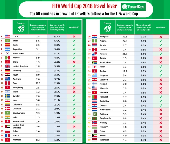 Всего за неделю до старта Чемпионата мира по футболу, который пройдет в России, аналитическая компания ForwardKeys опубликовала рейтинг 50 стран, наиболее активно готовящихся к предстоящему событию, в первую очередь, с точки зрения планируемых въездных турпотоков.