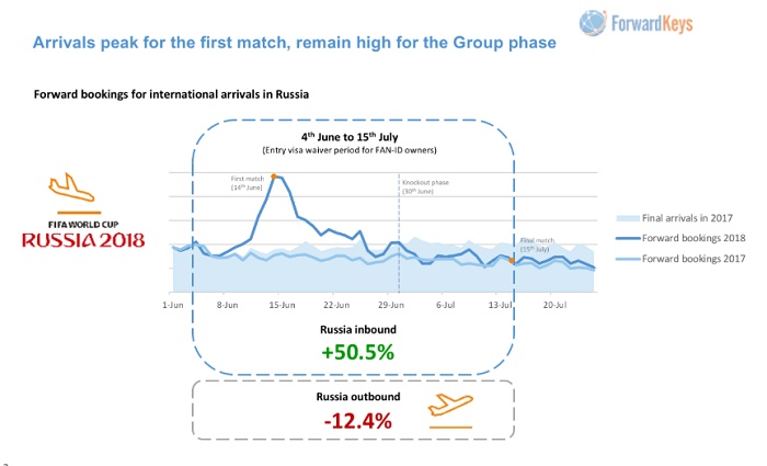 На период с 4 июня по 15 июля 2018 года бронирование авиабилетов в Россию на 50,5% выше, чем за аналогичный период прошлого года. Главная причина тому — стартовавший в стране Чемпионат мира по футболу.