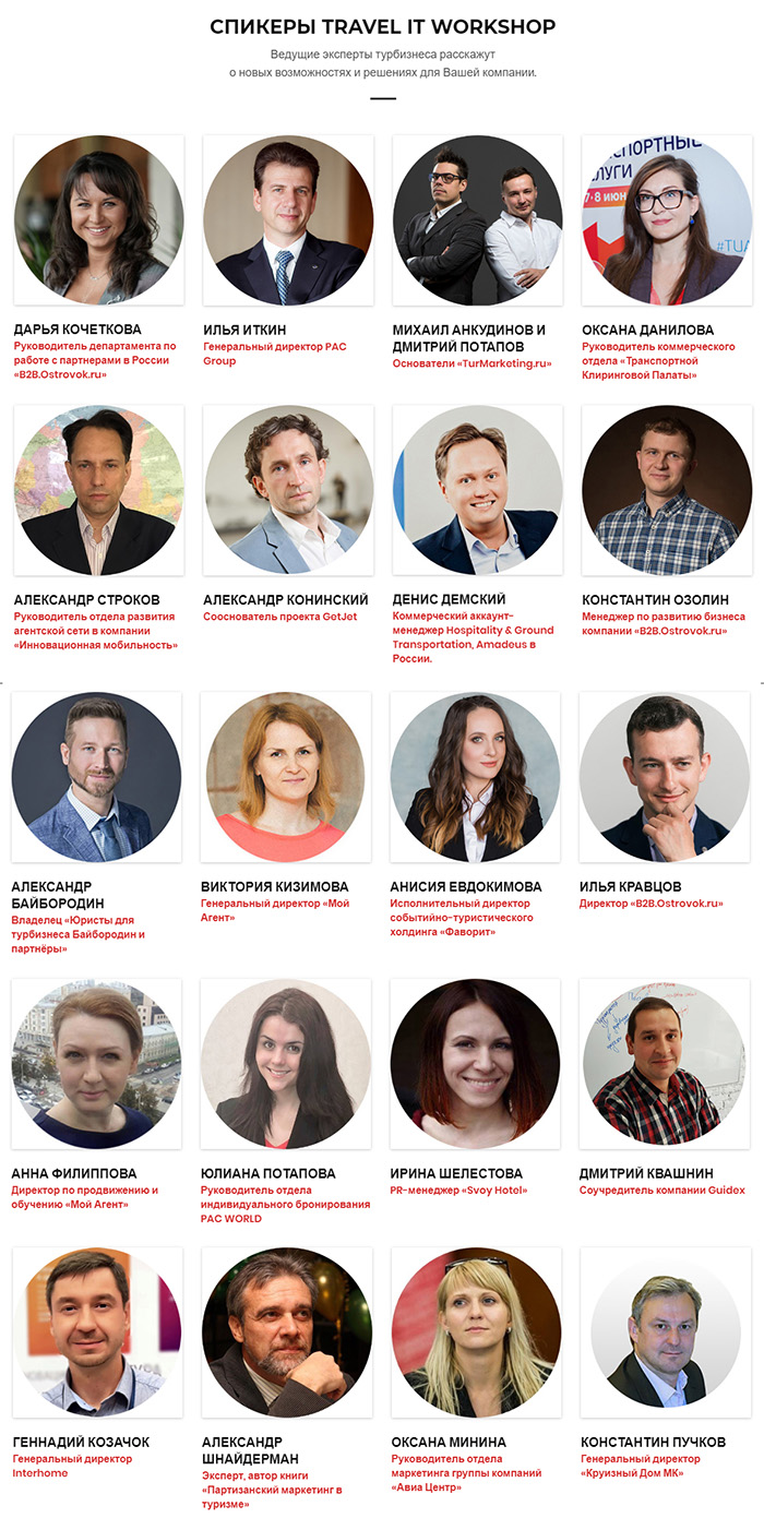 В мероприятии принимают участие ведущие эксперты рынка информационных технологий в туристическом бизнесе: Авиа Центр, B2B.Ostrovok, Amadeus, Александр Байбородин, GetJet, Слетать.ру, Svoy Hotel, ERV, Транспортная Клиринговая Палата, Турмаркетинг, Guidex и ещё более 20 компаний!