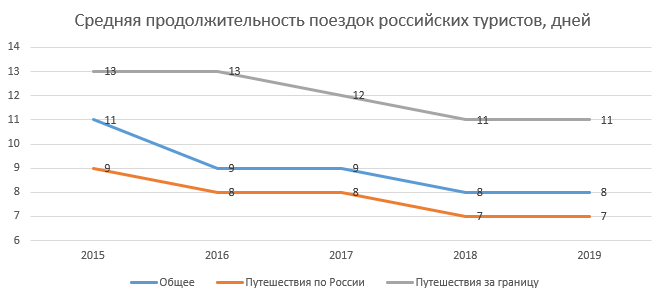 За последние 5 лет средняя продолжительность путешествий россиян сократилась на 3 дня, с 11 до 8 дней. Средняя продолжительность путешествий по России сократились с 9 до 7 дней, а за границу — с 13 до 11 дней. Такие данные следуют из аналитики бронирований авиабилетов