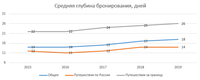 При этом россияне постепенно привыкают планировать свои путешествия заранее. Средняя глубина бронирования авиабилетов, то есть период от покупки до вылета, выросла на 4 дня: с 14 до 18 дней. По России за 5 лет средняя глубина бронирования выросла с 11 до 14 дней, а за границу — с 22 до 26 дней. При этом глубина бронирования по более доступным российским направлениям почти в 2 раза меньше, чем за границу.