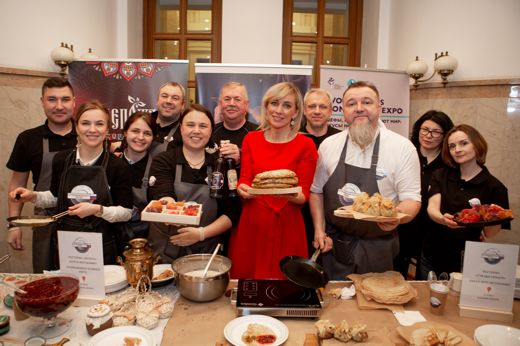 «Я хотела бы сегодня в рамках масличной недели анонсировать крупное культурное мероприятие, которое имеет непосредственное отношение к сохранению народных традиций и обычаев, оно запланировано в Республике Башкортостан. С 18 июля по 1 августа там состоится VI Всемирная фольклориада Международного Совета организаций фестивалей фольклора и традиционного искусства. Это масштабное мероприятие в России будет проходить в несколько этапов. Торжественное открытие состоится 18 июля в Уфе, а 19 июля пройдет шествие всех гостей в национальных костюмах. Именно с этой недели для представителей российских и иностранных СМИ на официальном сайте VI Всемирной фольклориады открыта аккредитация. В мероприятии примут участие более 3000 представителей (как запланировано) из 85 стран. На протяжении 14 дней коллективы стран и регионов будут общаться друг с другом с помощью культуры. Более подробная информация будет доступна на нашем официальном сайте. А сегодня МИД России и Федеральный проект «Гастрономическая карта России» в рамках проводимого в нашей стране в 2020 г. Года ремесел и промыслов после брифинга приглашают вас ознакомиться с нашими региональными традиционными блюдами, которые подаются во время Масленицы. Думаю, что вы не пожалеете», — сказала официальный представитель МИД России Мария Захарова в завершении брифинга.