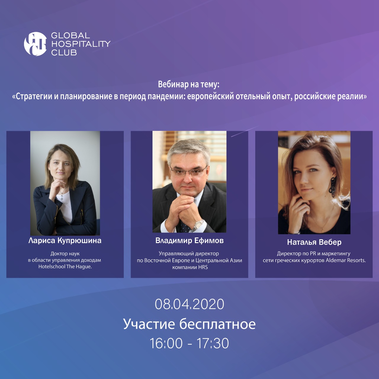 Вебинар состоится 8 апреля 2020 в 16:00 на платформе pruffme. Участие бесплатное для подписчиков telegram канала Russian Hospitality News: https://t.me/russianhospitalityawards (поиск по названию @russianhospitalityawards.