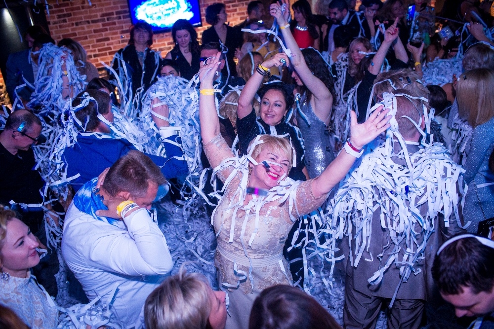 Полный зал гостей, среди которых агентства Объединенной сети, партнеры и их друзья на несколько часов перенеслись в детство и с удовольствием закидывали друг друга бумажным снегом.